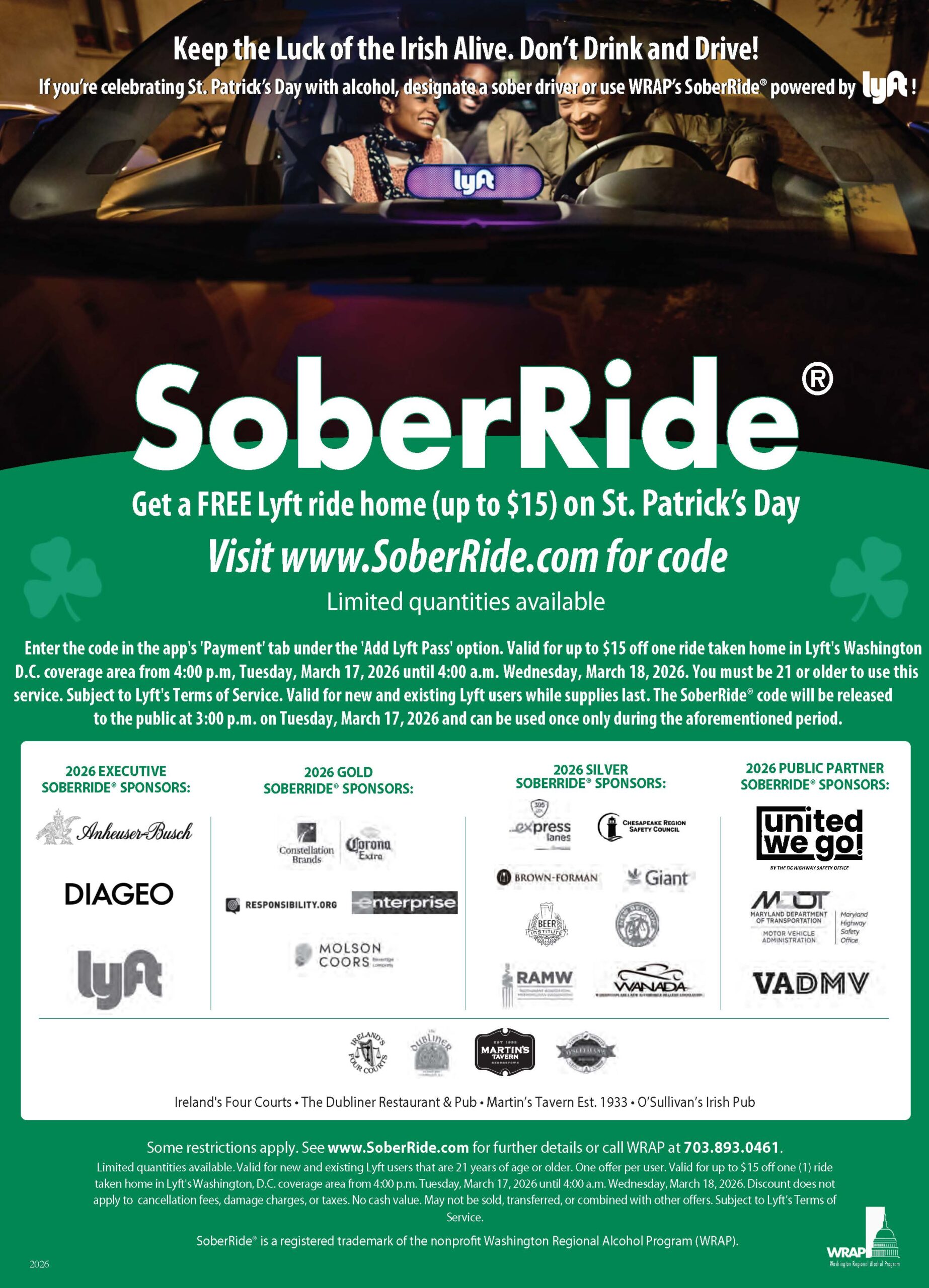 WRAP’s SoberRide® provides a free Lyft ride home up to $15.