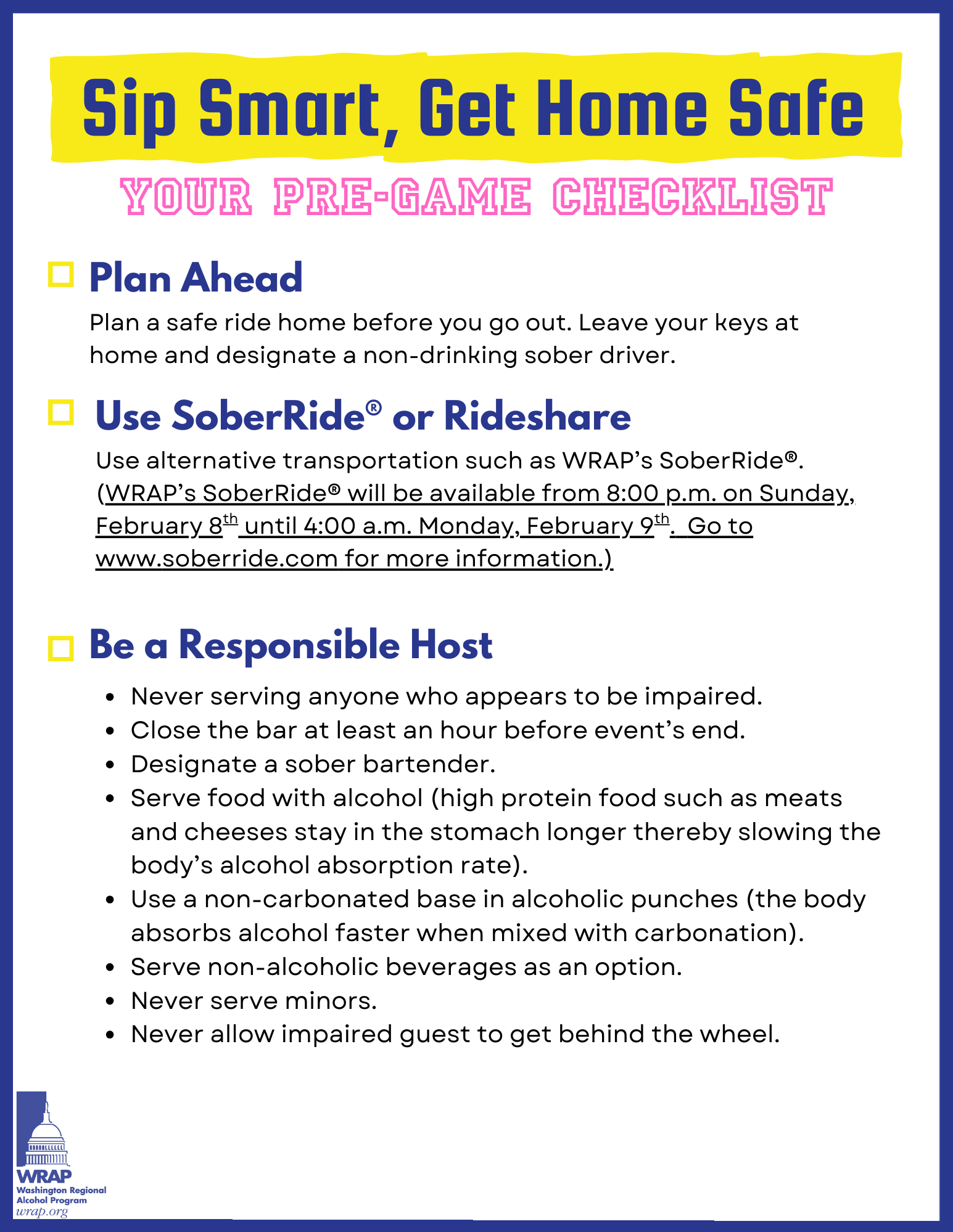 WRAP is a nonprofit [501(c)(3)], public-private partnership working to prevent drunk driving and underage drinking in the Washington-metropolitan region.