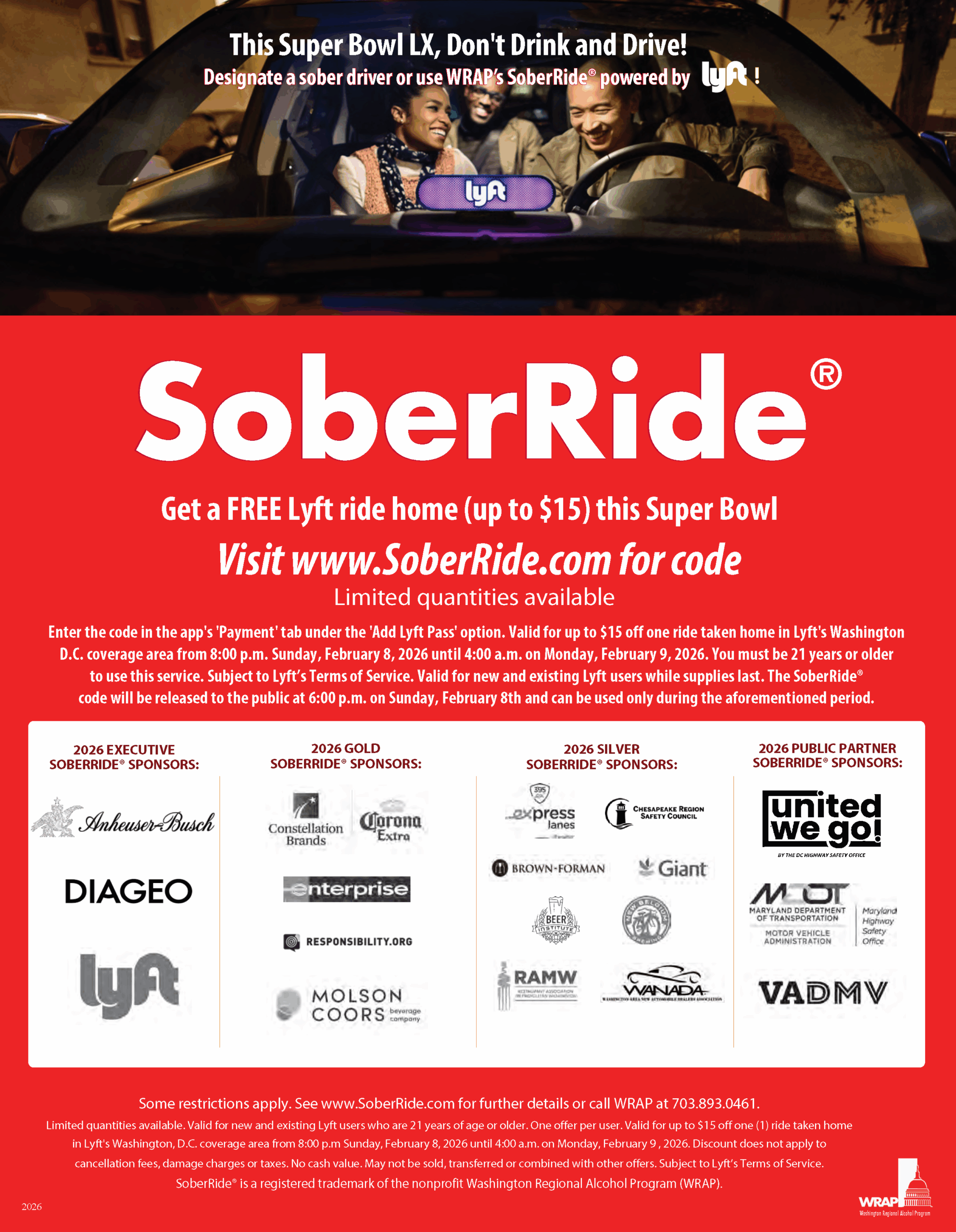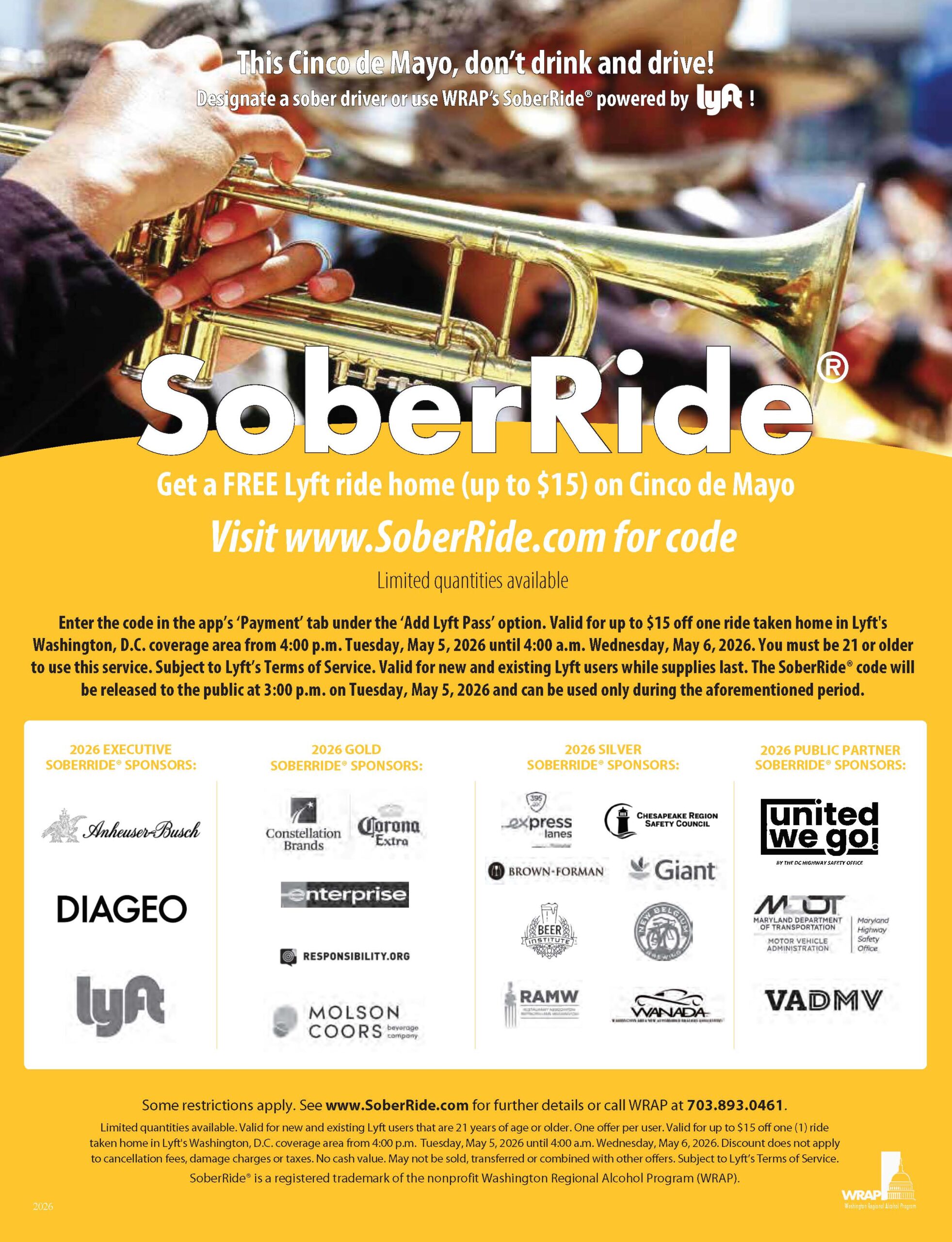 WRAP’s SoberRide®, called one of the nation’s most successful free safe ride programs for would-be impaired drivers, has helped to ensure greater Washington, DC residents have a safe way home on high-risk holidays. Since 1991, WRAP has provided 94,857 safe rides home. Currently, SoberRide® operates during the December/January holiday season, Super Bowl, St. Patrick’s Day, Cinco de Mayo, Independence Day and Halloween.